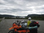 We awoke to light drizzle but with an increasing outlook for sun.  We were headed for Goose Bay, but we’d have an intermediate stop in Red Bay and it was to be an exciting experience, one that we’d not soon forget.  We left our combination hotel, restaurant, supermarket, high school building and packed the bikes.  Soon we were off the paved roads of the town of Churchill Falls and back out on the gravel of the Trans Labrador Highway.