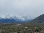 About an hour later, there it was; the pavement. It was indeed smooth, wide and it did indeed have excellent road markings. Oh crud, where’s the adventure in that? As a bit of an offset, the plains began to rise and turn into mountains. Green scrub turned into hills which turned into rock. Ultimately, the closer we got to El Chalten, the more we were surrounded by towering mountains; mountains with glaciers even. The thought of seeing the glaciers raised my spirits, and I was looking forward to seeing them. We stopped a couple of times to take some pictures but now the clouds were descending and the clouds had obscured some of the mountains from sight. Bummer! We did catch occasional glimpses of the end of a glacier, but nothing spectacular.