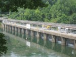 We rode a section of rather loose rocky gravel enclosed by trees. Branches of all sizes littered the road and there were some tree falls partially blocking the road as well. We rode around the tree falls and branches enjoying the somewhat cooler air in the trees. Ultimately, we ended up at a locked swinging gate that was supposed to barricade us from a wooden topped dam. We could ride around the swinging gate, but at the other end of the dam was a tall chain link fence that we could not get around.