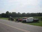 Although it was really, really hot, we were having fun on the lonely twisting roads.  We were not on powerful bikes, but it was still a joy to be on a lightweight machine swooping back and forth, playing with and on the curves.  Speeds and spirits were high until I rounded a corner and saw the unmistakable markings of a police cruiser.  I was about to grab the brakes but just beyond the cruiser sat another car parked next to the cruiser.  It was an orange Dodge Charger with Confederate stripes on the roof.