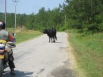 Before we knew it, we had transitioned into back onto hard surfaced roads and farms once again began made began dotting the landscape. Most were fairly large and crossing from one to the next took some time. We had passed several and as we rounded a corner and headed down a straight stretch of road, we came across a somewhat immovable object. There was a very large animal standing in the middle of the road.