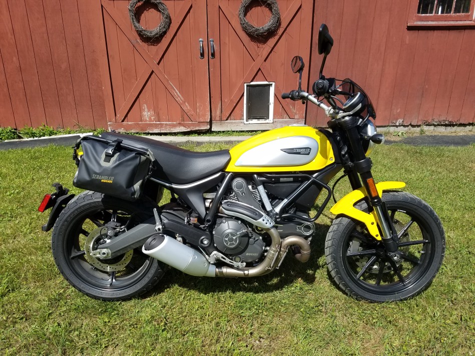 The soon to be “adventurized” Ducati Scrambler Icon. Note the dry bags and very small case guards that came with the bike.