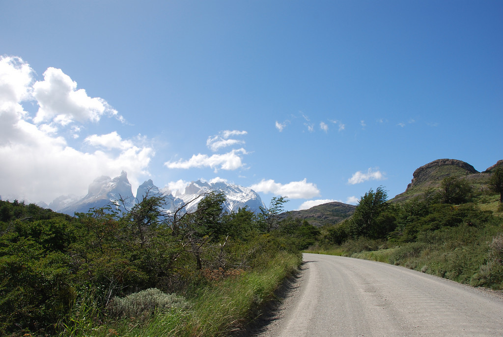 Back on the gravel, we continued to experience towering mountain views and twisty mountain roads. Riding up and over mountain passes and down steep roads, we felt like we had become one with the surrounding landscape. In fact, in some areas, we literally became one with the surroundings. Recent road construction had chopped huge chunks out of the surrounding granite. Walls of rock surrounded us on both sides, while chunks recently rendered from the earth lay at the road’s edge and sometimes in the road itself. Looking up at roughly hewn rock walls at both sides of the road, we made our way through the earth towards Tierra del Fuego.