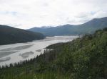 Hmmm… After about 20 minutes of this type of riding I began to wonder whether we were indeed on the correct road. But shortly thereafter, the road began to widen and some beautiful vistas became evident. Below us glowing a bright silver in the late day sun was what/who we would find out was the Copper River. She was wide and wonderful, carving large sweeping swaths between the mountains, sometimes running fast with white water, and other times merely dawdling along. She was full of life and effortlessly showed her power while letting her magnificence be known. She was breathtaking and she knew it.