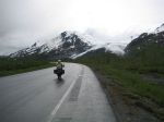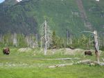 The only thing I could do was nail the brakes and try to avoid hitting the blurs. Then it dawned on me. As we were packing our gear, the agents that we used to ship Kim’s bike warned us that it was moose calving season and the moose were plentiful and wherever you might see a moose, there might be a calf with it. Well surer than heck, I’d just found my first two moose in Alaska. I managed to get my heavily loaded bike stopped about 10 feet short of and behind the adult female moose and the calf which was running with her. They both continued running across the road and down the opposite embankment.