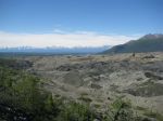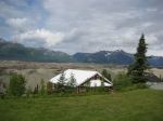 So with great difficulty, we soldiered on without stopping. After about 5 hours of stopping and starting on the road, we came upon the only place on the highway that serves food. We had seen only two or three vehicles the entire time we were on the highway, but as we pulled into the parking lot of the Gracious House and the Home Style Cooking Cafe we found where they all were. The dirt parking lot was packed and there was not a single seat in the house. Not one. We waited about 20 minutes and not a single seat opened. We then broke the code and decided that our lunch would consist of almonds, cashews, power bars and water, served on a bluff overlooking mountains and glaciers.