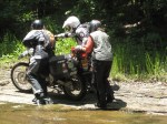 Now the three of us stared at Tracy’s stricken machine while Kim stood at the side of the crossing taking pictures. For posterity! Surely three of us could easily pick up a 650cc motorcycle! But it was not to be. Each time we reached down to pick it up, we started scrambling for footing. This algae was slimy! So in a concerted and coordinated manner we proceeded to pick the bike up. After a couple of tries, we were able to get it back on two wheels. Now all we had to do was push it across the water crossing.