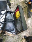When we had all four bikes across, it was time to inspect Tracy’s bike for damage. His right pannier was damaged significantly. It was bent backwards and downwards and its perfect rectangular shape was now a very interesting trapezoid. The lid lay hanging at the side of the pannier but it had retained its shape. Once we flipped the lid over the top of the pannier, two separate gaping isosceles triangles appeared under the lid leaving the contents of the pannier in the elements.